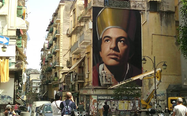 こちらは2015年の祭りに合わせて製作されたナポリのストリート・アートです。高さ15メートルに及ぶ聖人の肖像画は、オランダ系のナポリ人 Jorit Agoch という画家が無料で製作したそうです。ナポリの国際性を感じさせます。最初彼の肖像が民族主義(人種差別)的観点で問題になったそうですが、彼はナポリの街で普通に暮らす人をモデルに、要するにカラヴァッジョのようにした、ということで問題は解決し、作品は賞賛されています。この作品は司教座聖堂サン・ジェンナーロからすぐ近くにあります。