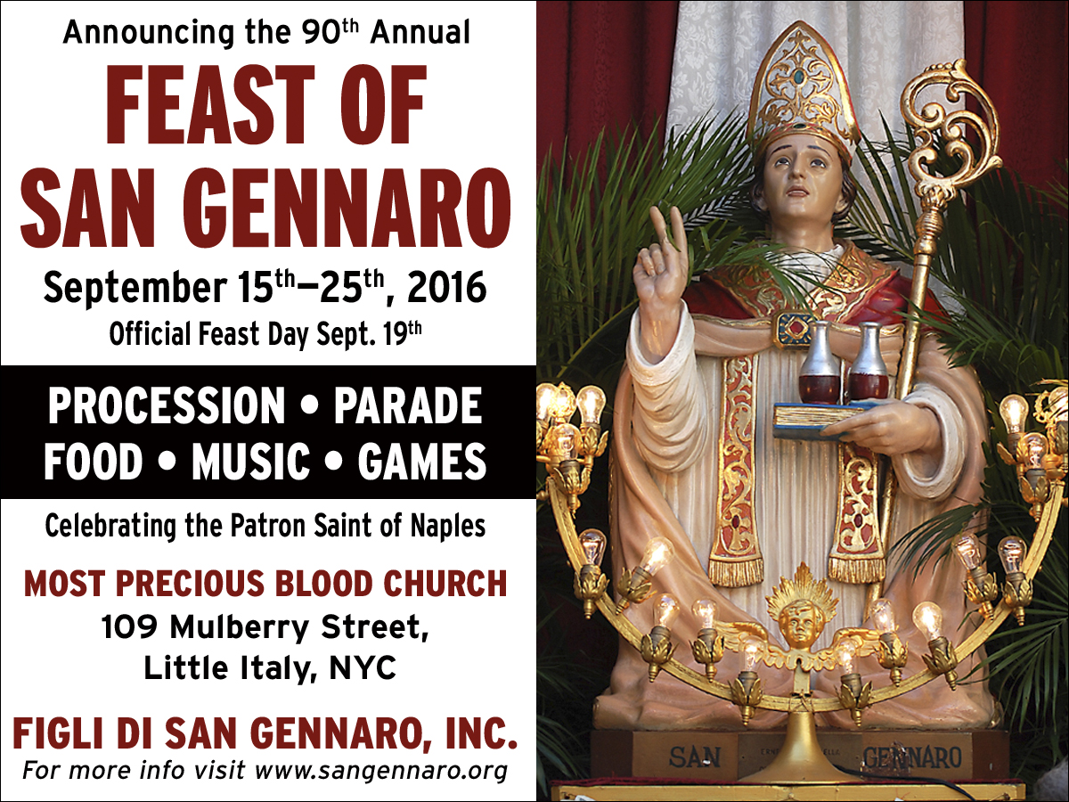 2016年のニューヨークのポスターです。宗教行事、行列、食べ物、音楽、ゲームとあるように、イタリア由来のカンネッローニなどのお菓子が出るのも有名です。聖人の像は祝福というより、Vサインをしているように見えます。手にはなぜか二本の瓶を持っていて、ワインかソースみたいです。