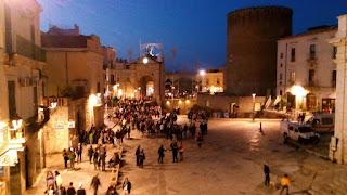 プーリア独特の、白く質素で、要所にロマネスクらしい浮き彫りを施した力強い形態です。地下も発掘され、印象深いバルダッキーノ(身廊の祭壇を覆う天蓋のある建造物でロマネスクの特徴)も完全な姿をとどめています。